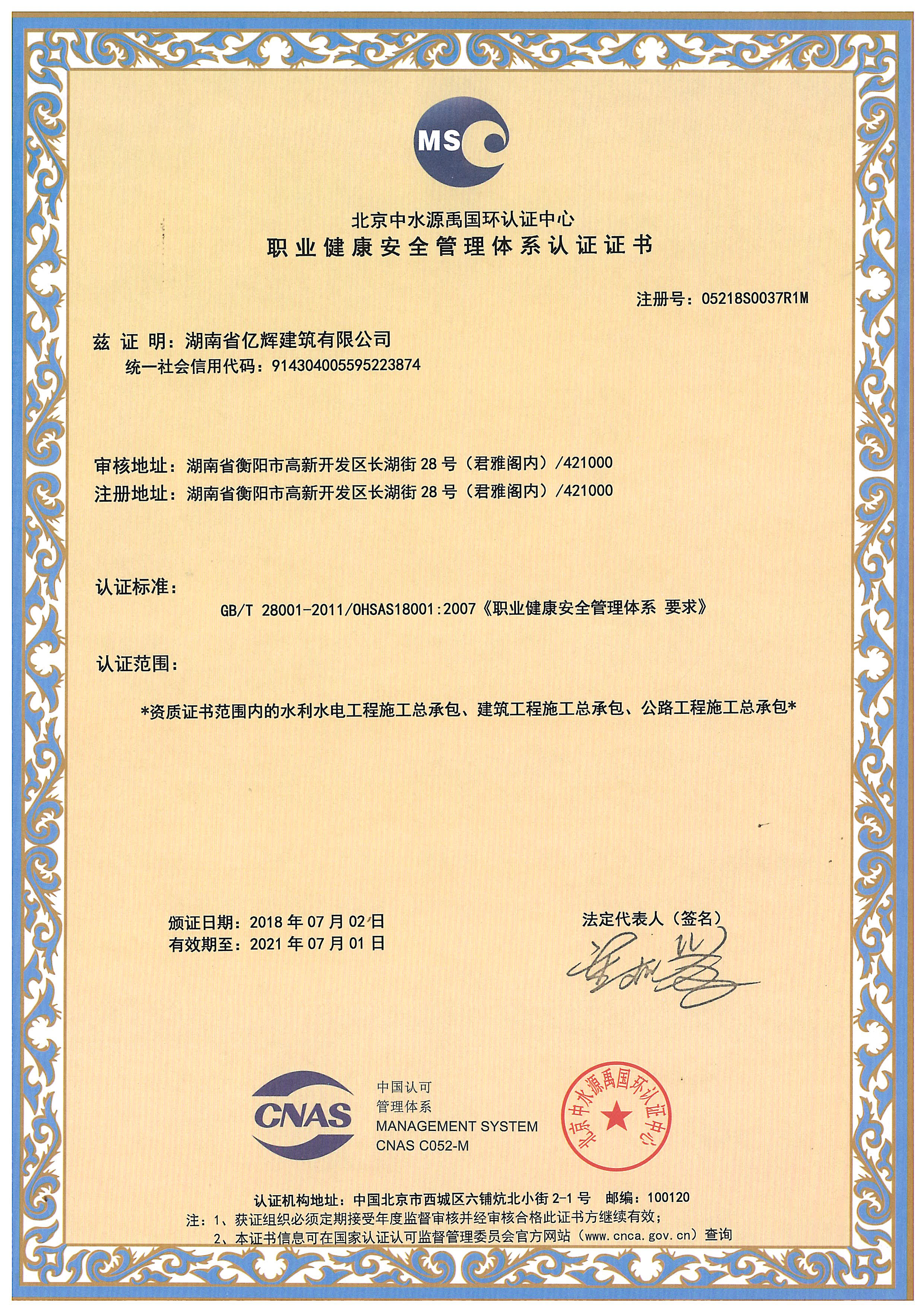 職業(yè)健康安全管理體系認(rèn)證證書