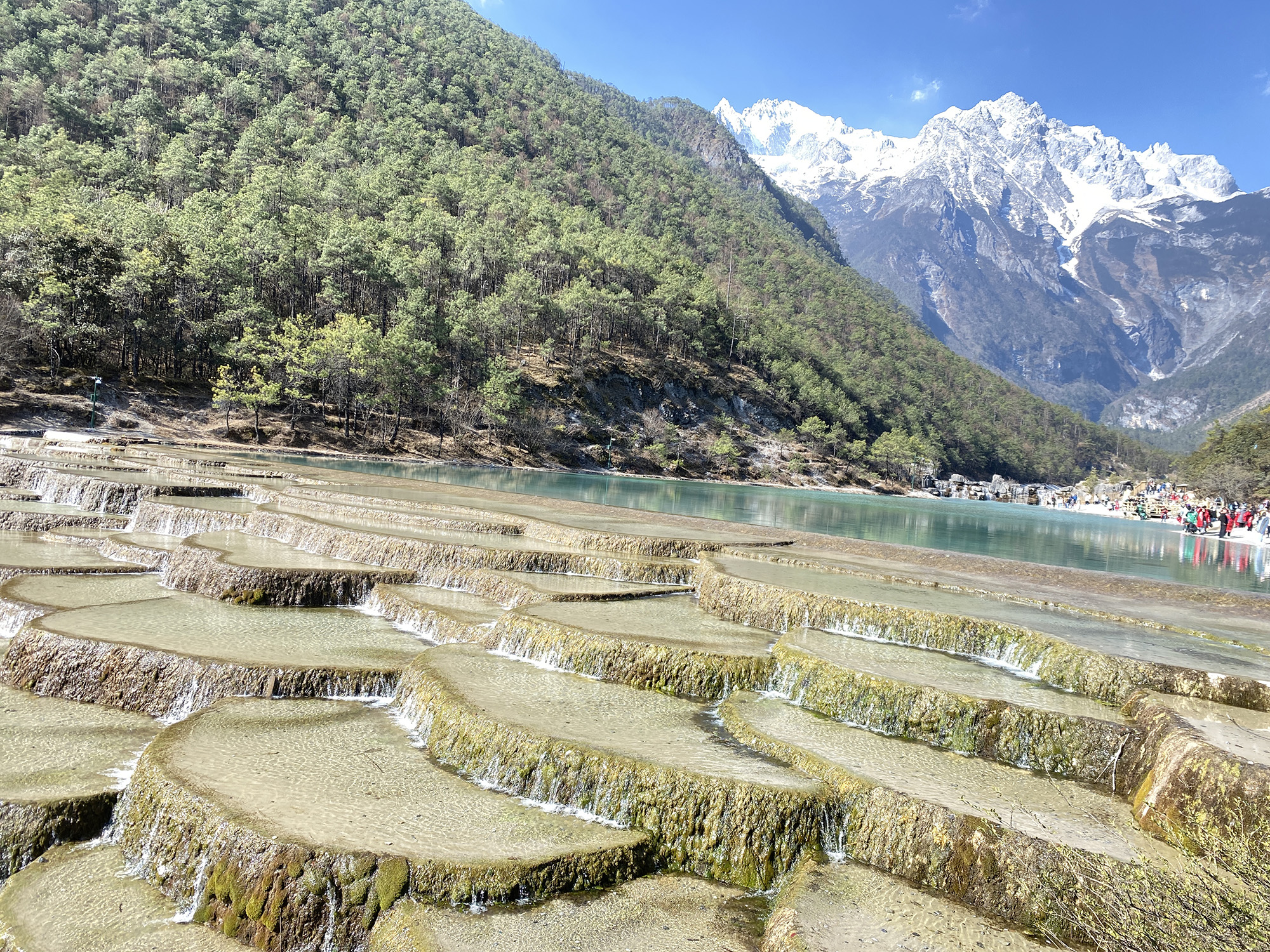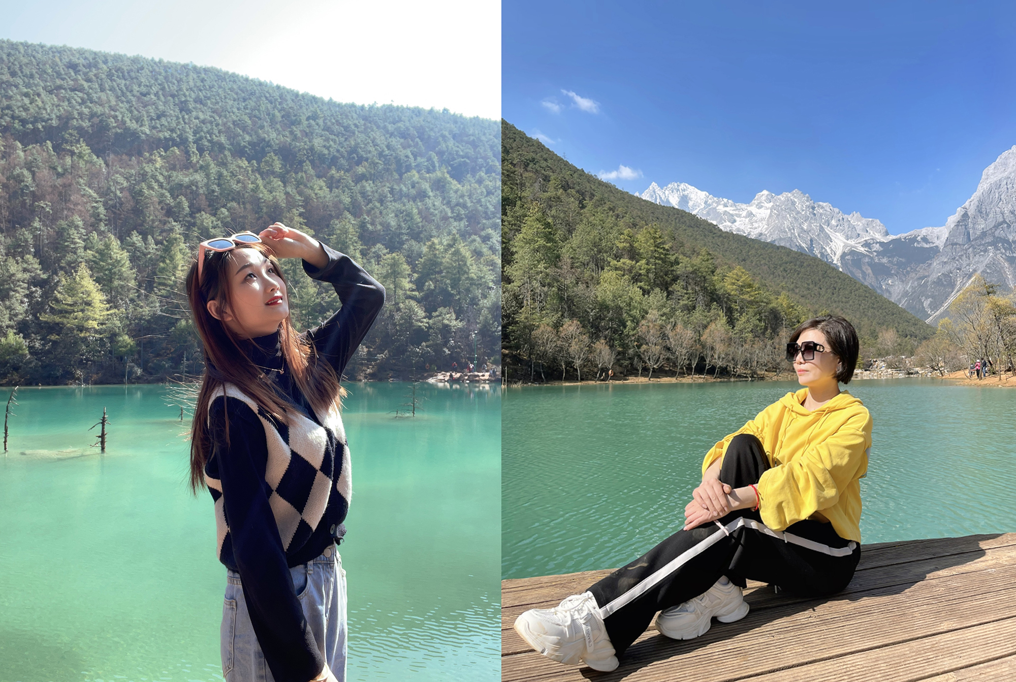 從玉龍雪山下來,我們迅速去往景區(qū)旅游大巴車的換乘站,去尋找玉龍雪山山神遺留在山腳下的藍(lán)寶石項(xiàng)鏈,人間秘境藍(lán)月谷。走進(jìn)藍(lán)月谷內(nèi),玉液湖、鏡潭湖、藍(lán)月湖等數(shù)個(gè)大小不一的湛藍(lán)湖泊簇?fù)碓谝黄穑q如一彎巨大的藍(lán)色月亮靜臥在玉龍雪山的懷抱之中,這樣的景色,美到令人心生敬畏。不遠(yuǎn)處白雪皚皚的玉龍雪山倒影在澄澈的湖面上,周邊層林盡染,色彩如油畫一般,此時(shí)望著天上云卷云舒,頗有“半畝方塘一鑒開,天光云影共徘徊”的詩鏡。