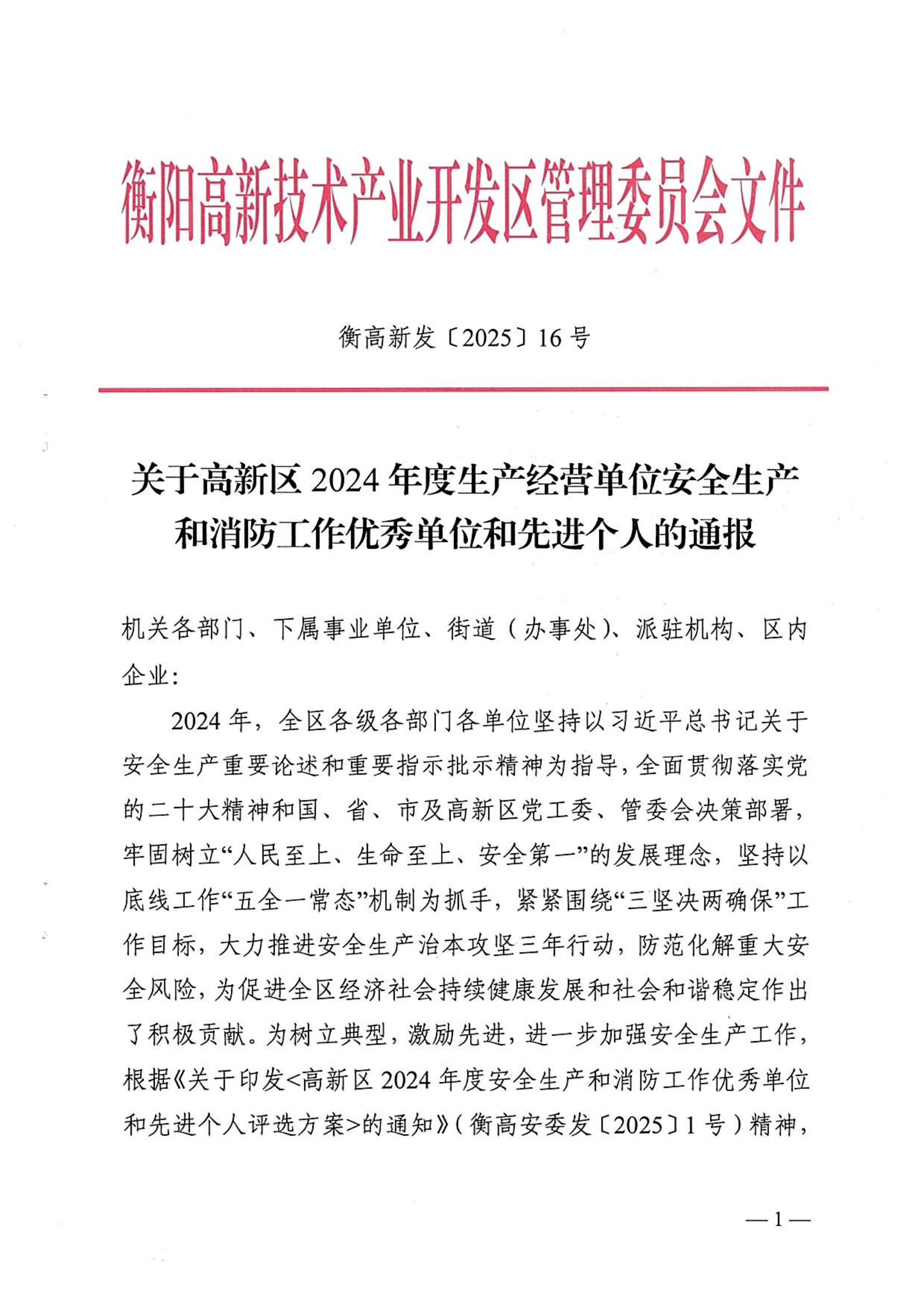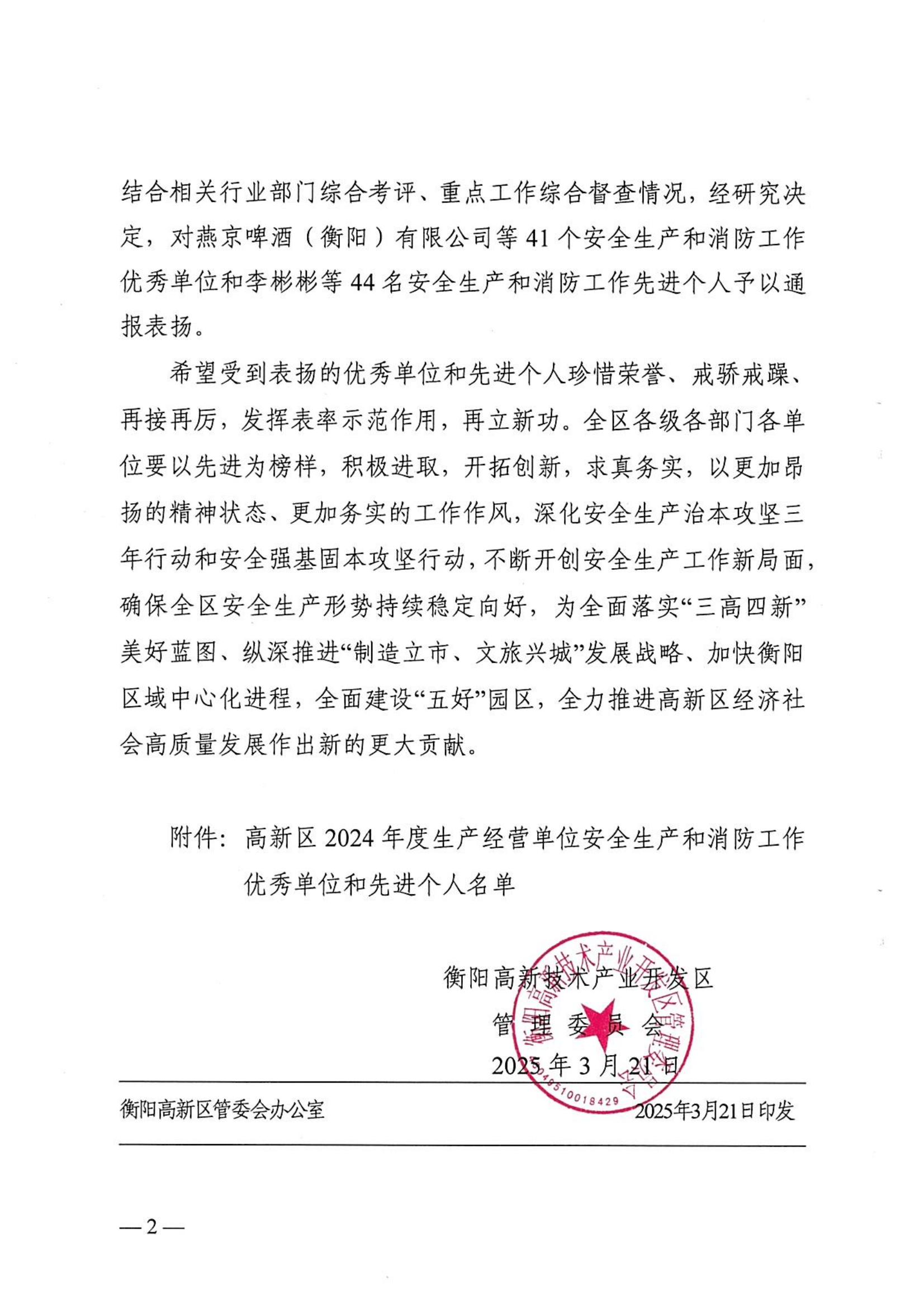 喜訊!億輝集團榮獲“衡陽市高新區(qū)2024年度生產經營單位安全生產和消防工作優(yōu)秀單位”稱號