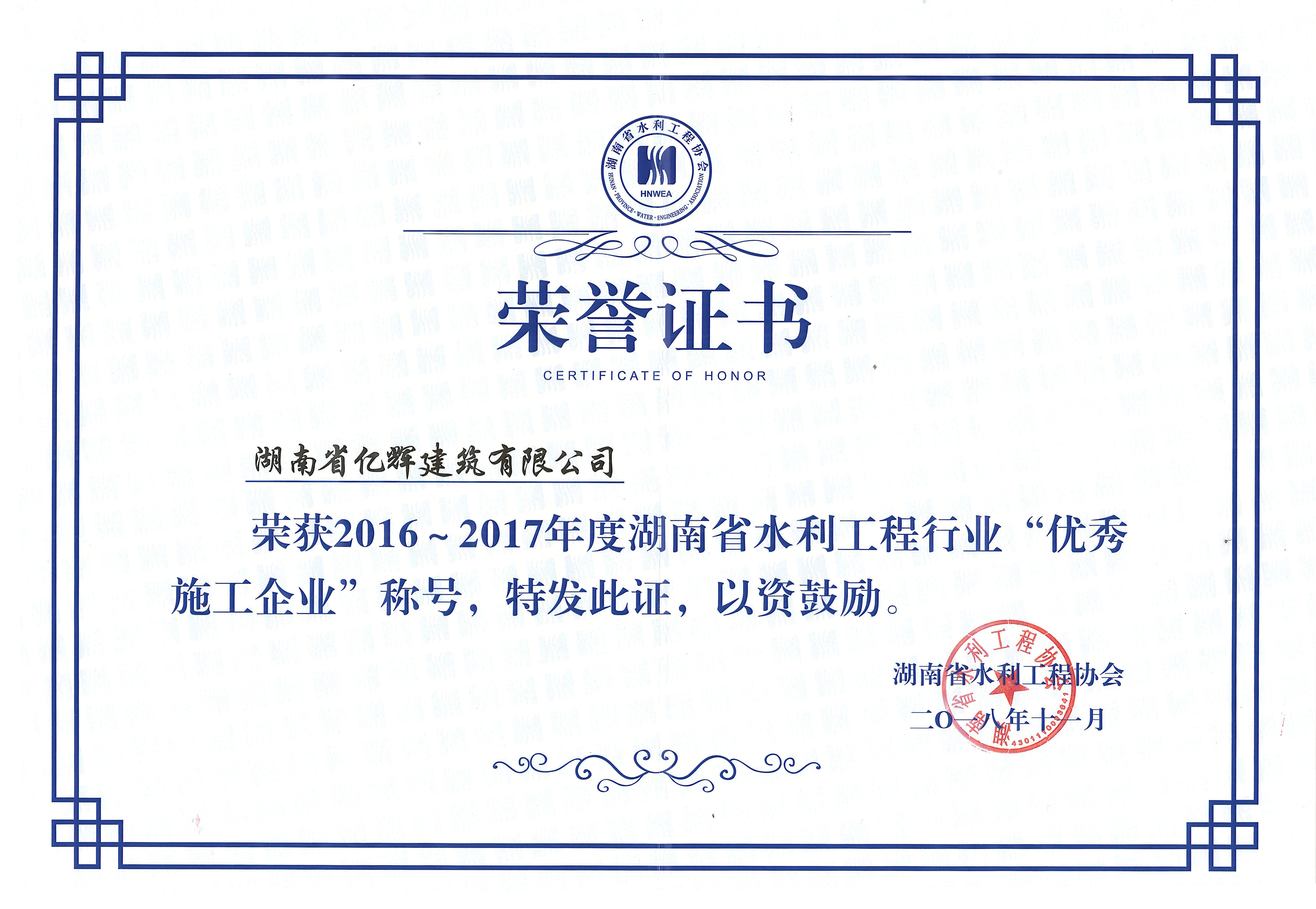 榮獲2016~2017年度湖南省水利工程行業(yè)“優(yōu)秀企業(yè)”