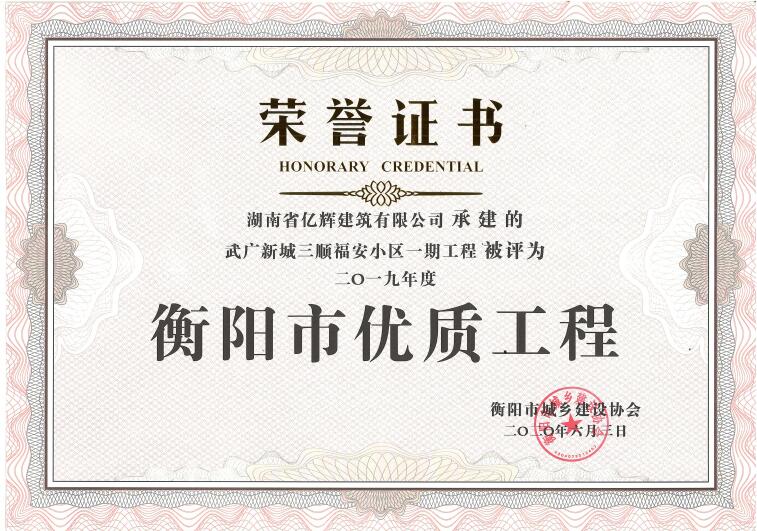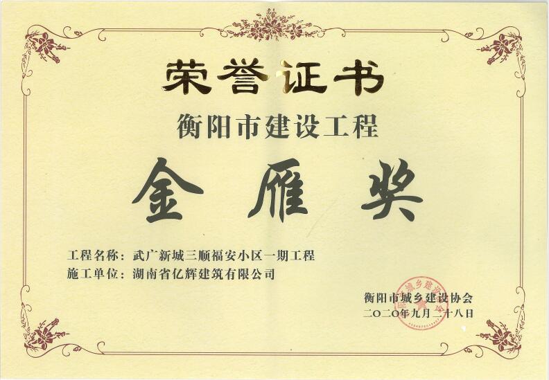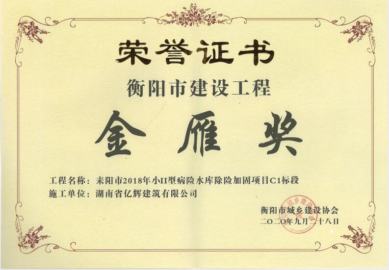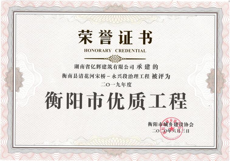 武廣新城三順福安小區(qū)一期工程榮獲衡陽(yáng)市“金雁獎(jiǎng)”、“市優(yōu)質(zhì)工程”, 耒陽(yáng)市2018年小Ⅱ型病險(xiǎn)水庫(kù)除險(xiǎn)加固項(xiàng)目榮獲衡陽(yáng)市“金雁獎(jiǎng)”、“市優(yōu)質(zhì)工程”, 衡南縣清花宋橋-永興段治理工程榮獲衡陽(yáng)市“市優(yōu)質(zhì)工程”,2020年被評(píng)為水利部信用等級(jí)評(píng)價(jià)AAA企業(yè),連續(xù)五年被評(píng)為省、市“守合同重信用單位”。