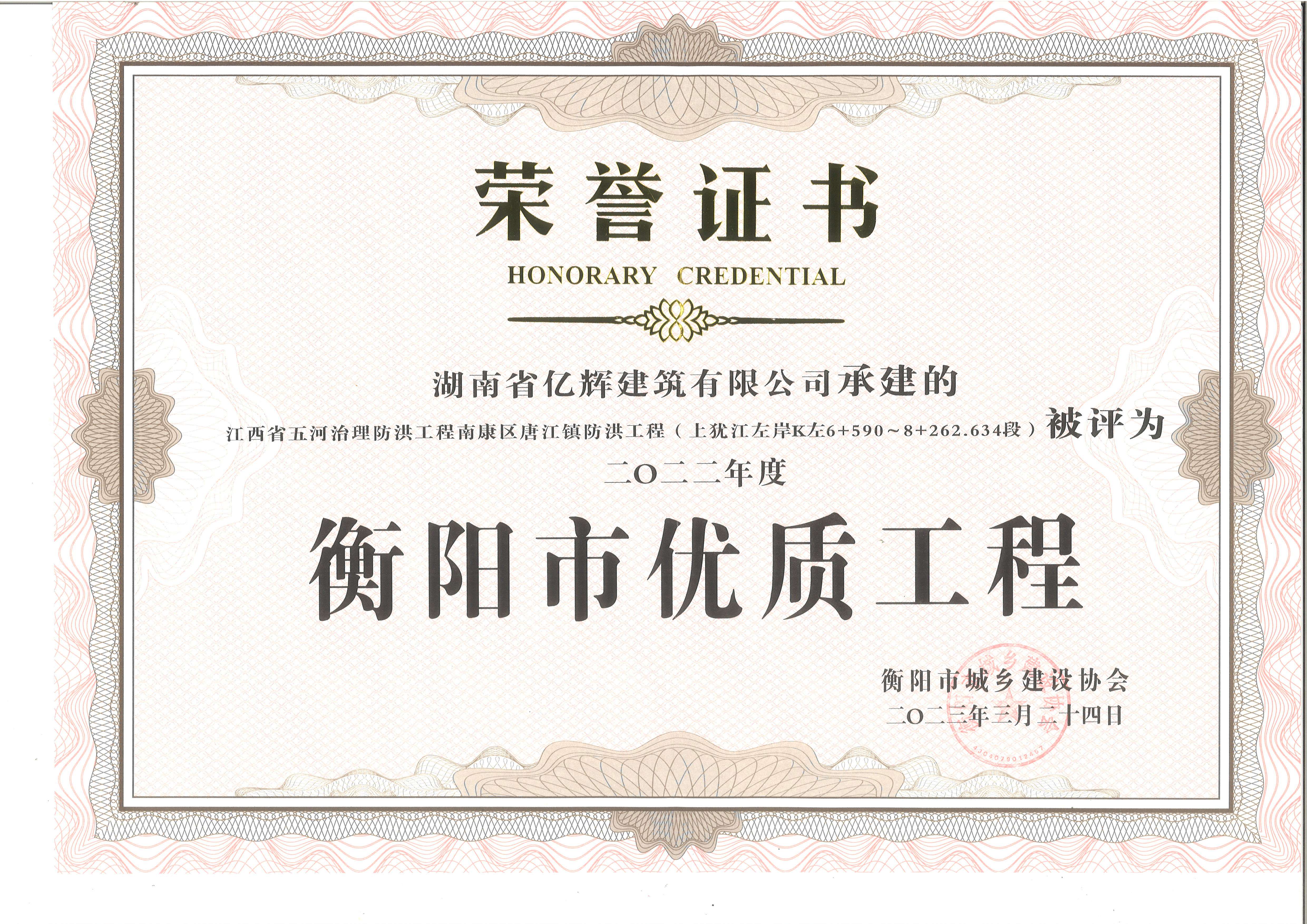 江西省五河治理防洪工程南康區(qū)唐江鎮(zhèn)防洪工程(上猶江左岸K左6+590~8+262.634段)榮獲衡陽市“市優(yōu)質工程”、“金雁獎”,湖南省湘江重要河段(衡南縣“四水治理”近尾洲管山段岸坡整治等8處)治理工程(Ⅲ期)第一標段榮獲衡陽市“市優(yōu)質工程”、“金雁獎”,蒸湘區(qū)204畝儲備地村民安置房項目設計施工采購總承包榮獲衡陽市“市優(yōu)質工程”、“金雁獎”